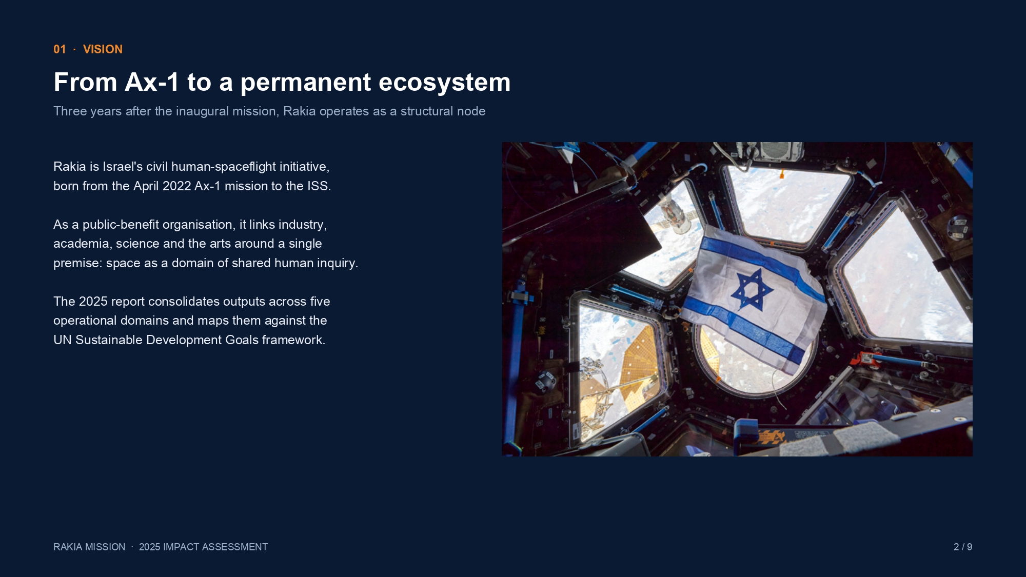 The Rakia Mission 2025 Impact Report reveals an Israel civil space ecosystem consolidating around human spaceflight diplomacy. Rakia’s reach grew to over two million digital views, 20,000 exhibition visitors, and 20,000 lecture attendees, while co‑leading international missions and anchoring space‑peace and education initiatives globally.